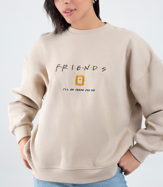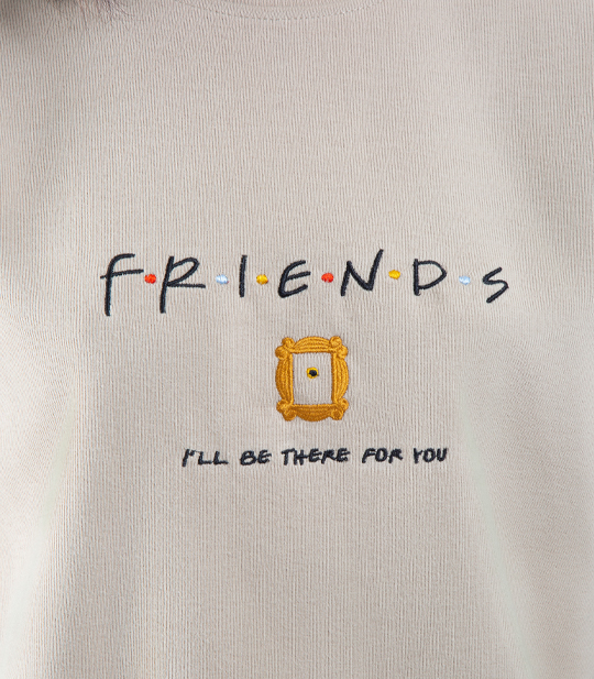 جذابترین بخش این بلوز، گلدوزی کوچک روی سینه است؛ طرح لوگوی سریال Friends همراه با قاب زرد معروفی که روی چشمیِ درِ خانهی مانیکا دیده میشد. همین جزئیات ساده اما نوستالژیک، بلوز را به انتخابی محبوب برای طرفداران سریال و علاقهمندان به استایلهای آیکانیک تبدیل میکند.