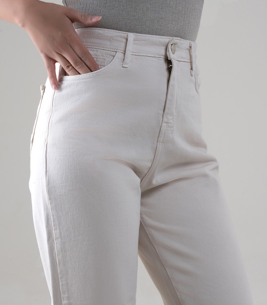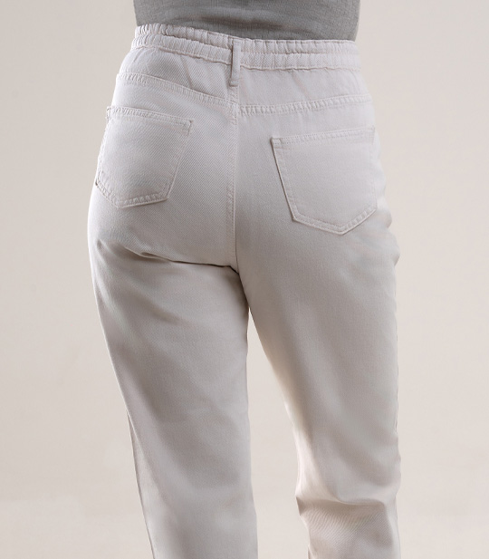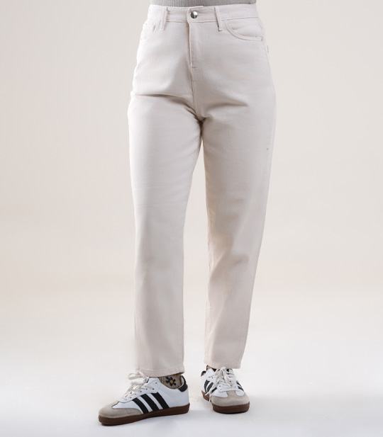 شلوار کتان کد 306158 با فرم مام فیت و رنگ کرم، انتخابی مدرن و راحت برای استایل روزمره است.