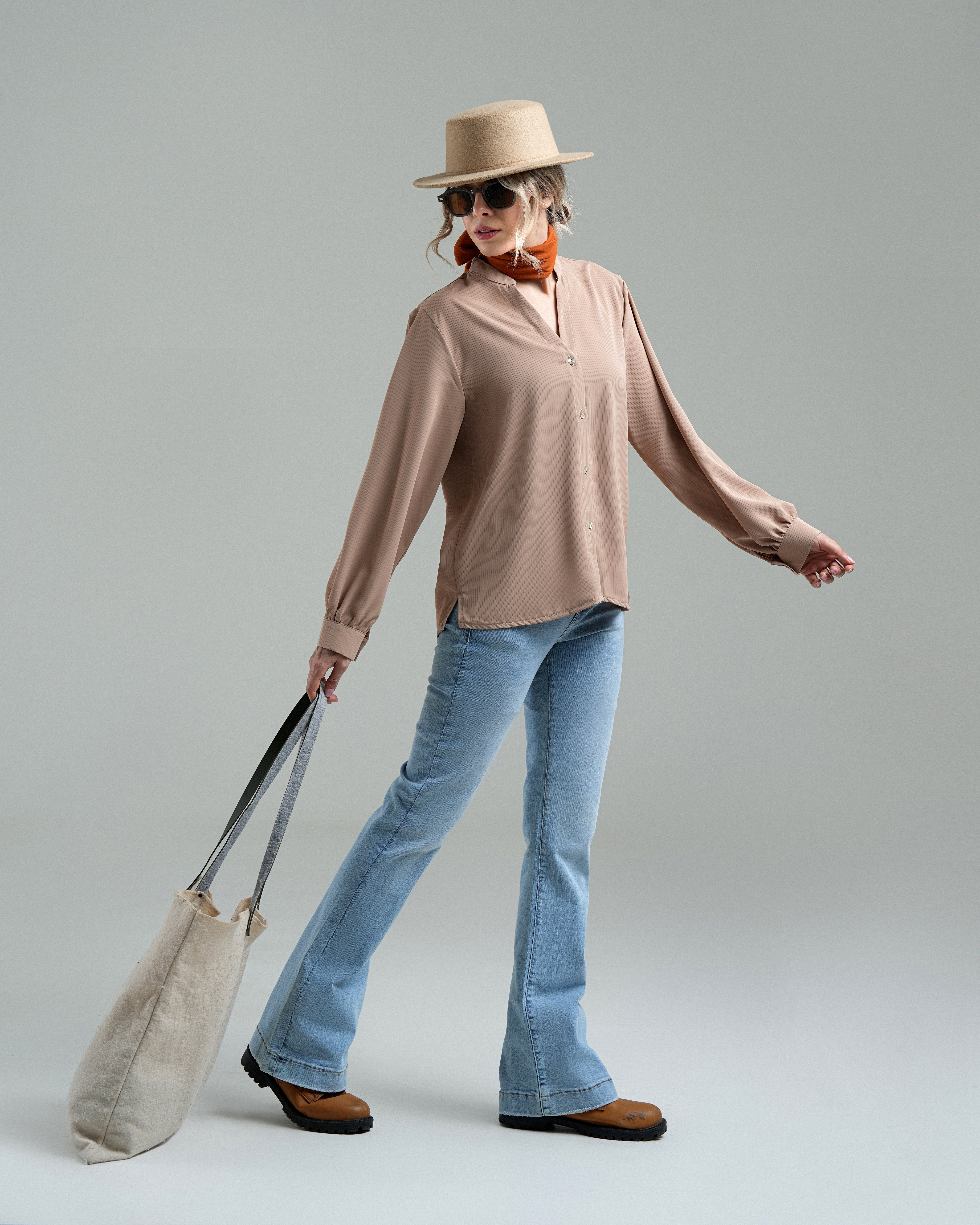 آستینهای فانوسی و یقه هفت، حالتی رمانتیک و ظریف، به ظاهر شومیز میدهند و باعث میشوند همزمان زنانه و مدرن دیده شود.