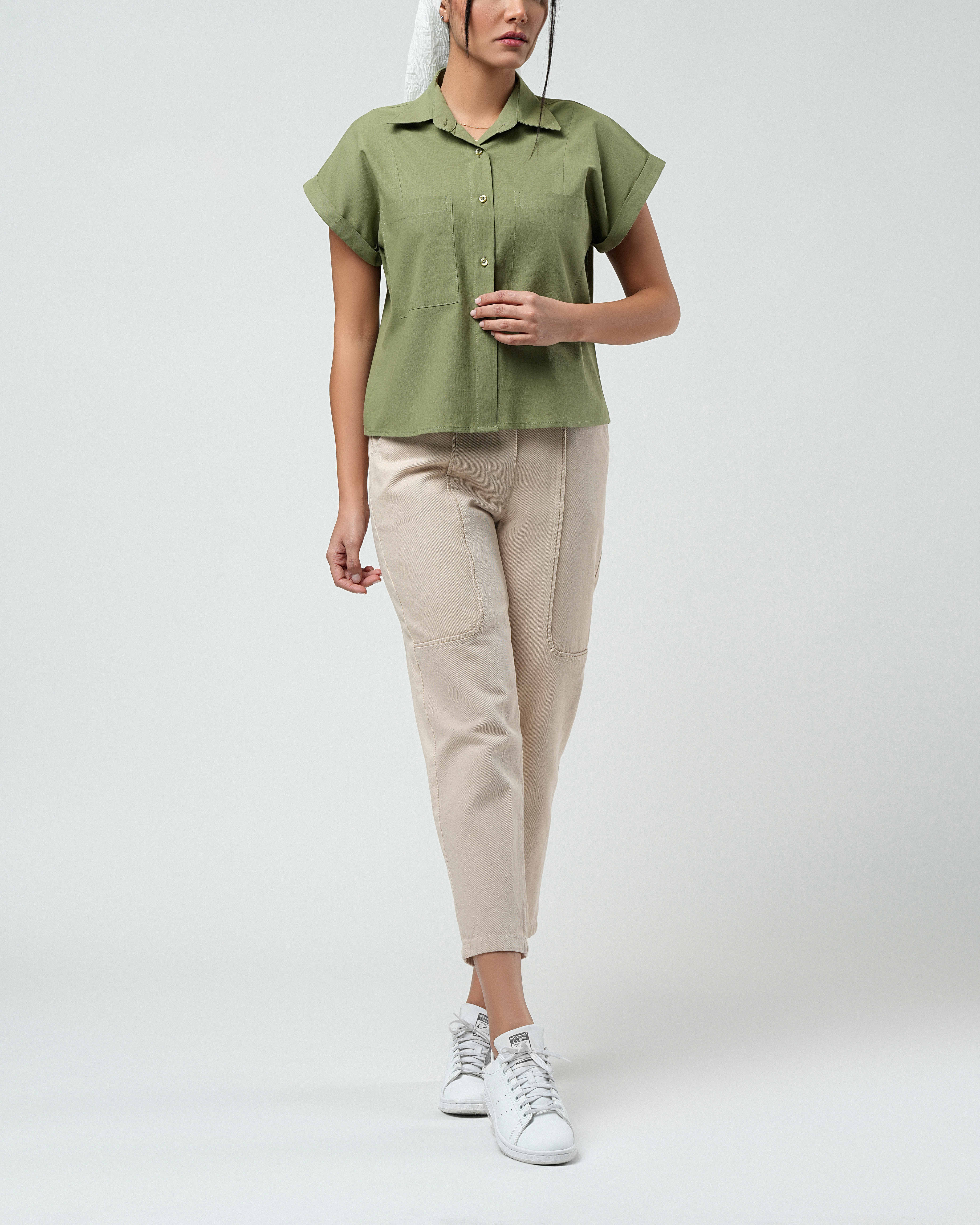این شومیز از پارچه لینن اسلپ با کیفیت بالا دوخته شده که سبک، نرم و تنفسپذیر است.