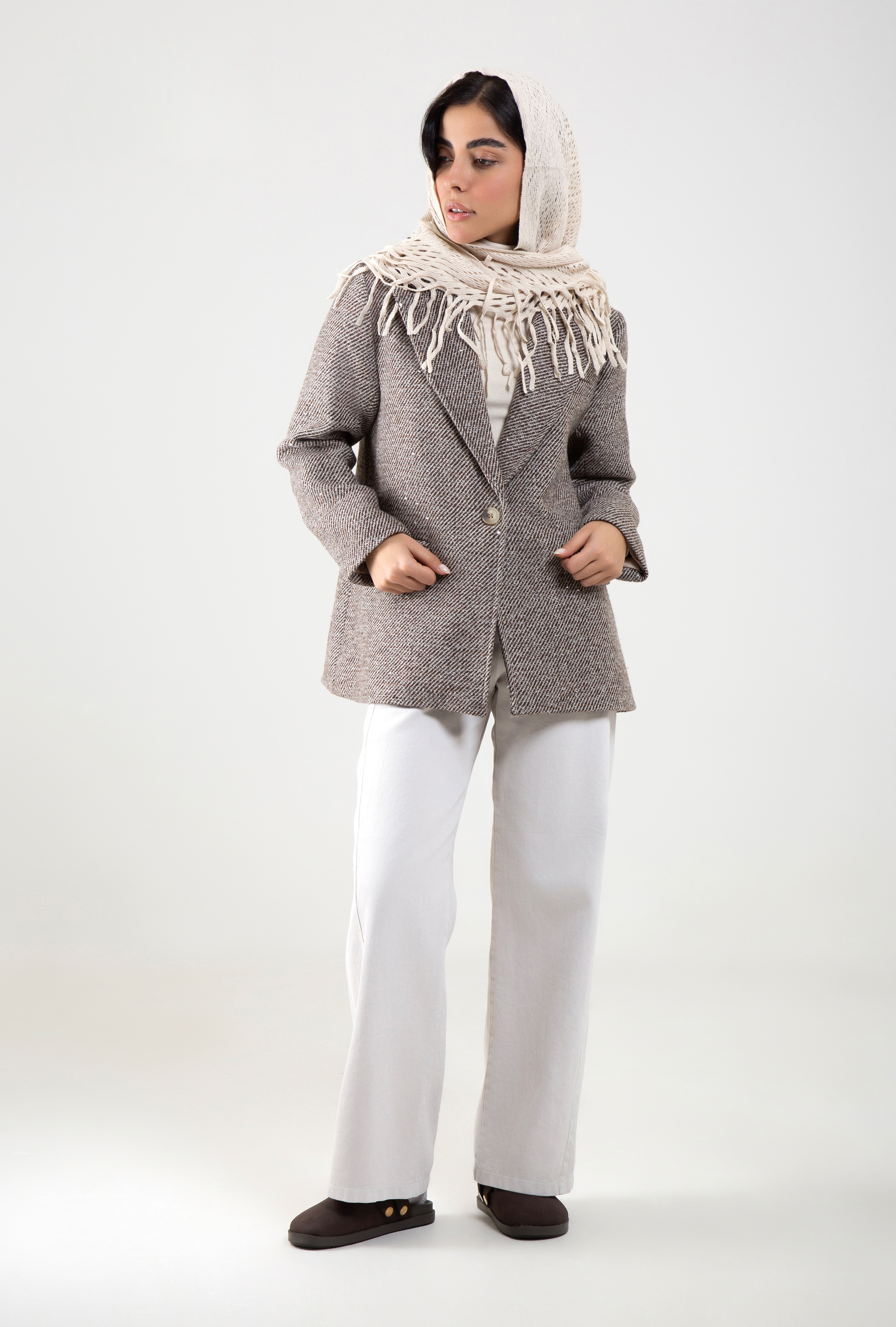 این کت از پارچه فوتر پولکدار دوخته شده؛ جنسی گرم، نرم و مقاوم که برای فصول سرد سال بسیار مناسب است. بافت فوتر باعث میشود بدن را در برابر سرما حفظ کند و پولکهای ظریف ظاهر کت را لوکس و متفاوت میسازد. این پارچه هم برای استفاده روزمره و هم برای حضور در موقعیتهای نیمهرسمی گزینهای باکیفیت و بادوام است.