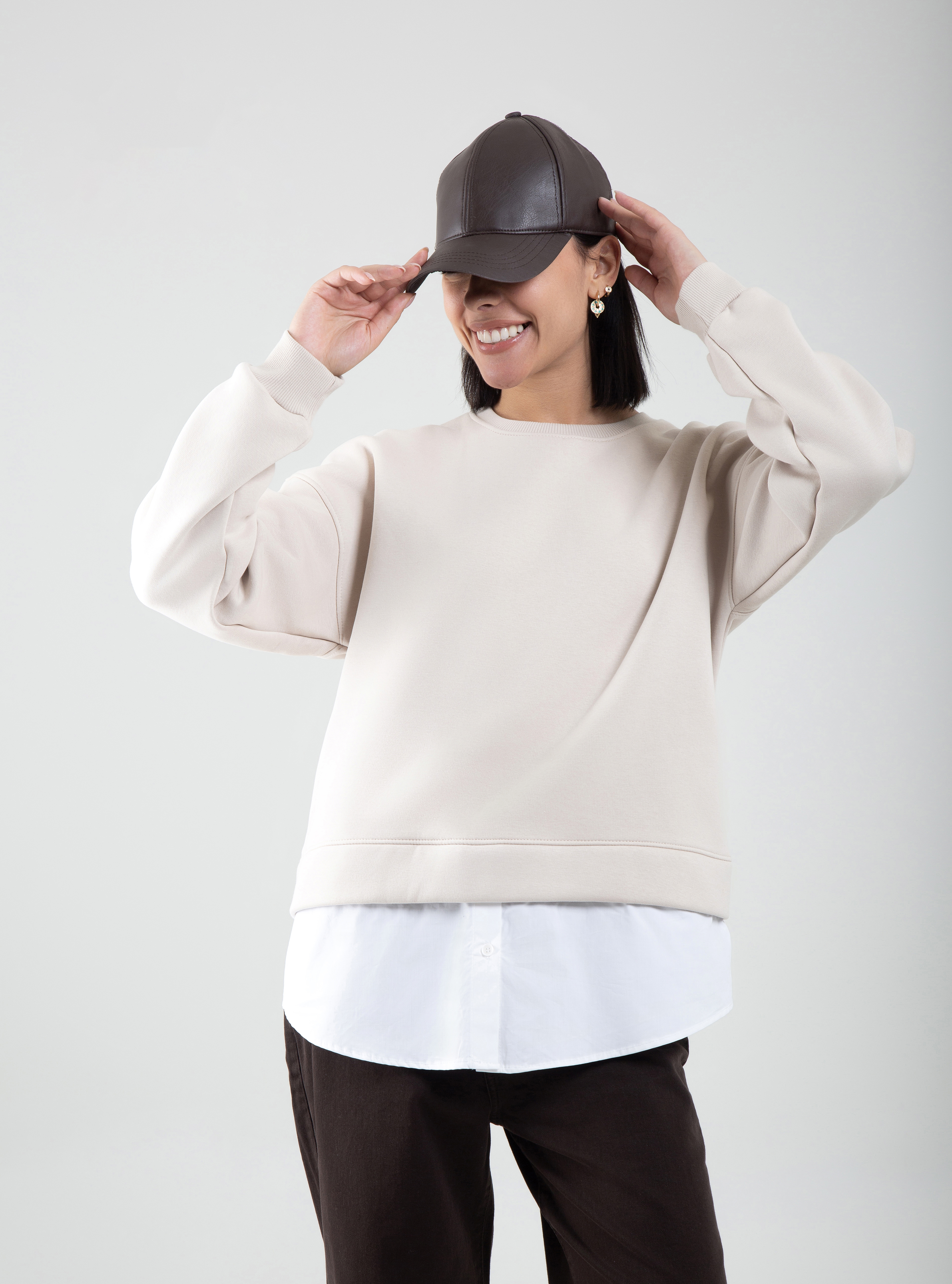 این مدل در نگاه اول یک بلوز ساده و مینیمال به نظر میرسد، اما بخش پایینی آن از جنس پوپلین سفید دوخته شده که حالتی لایهای ایجاد میکند؛