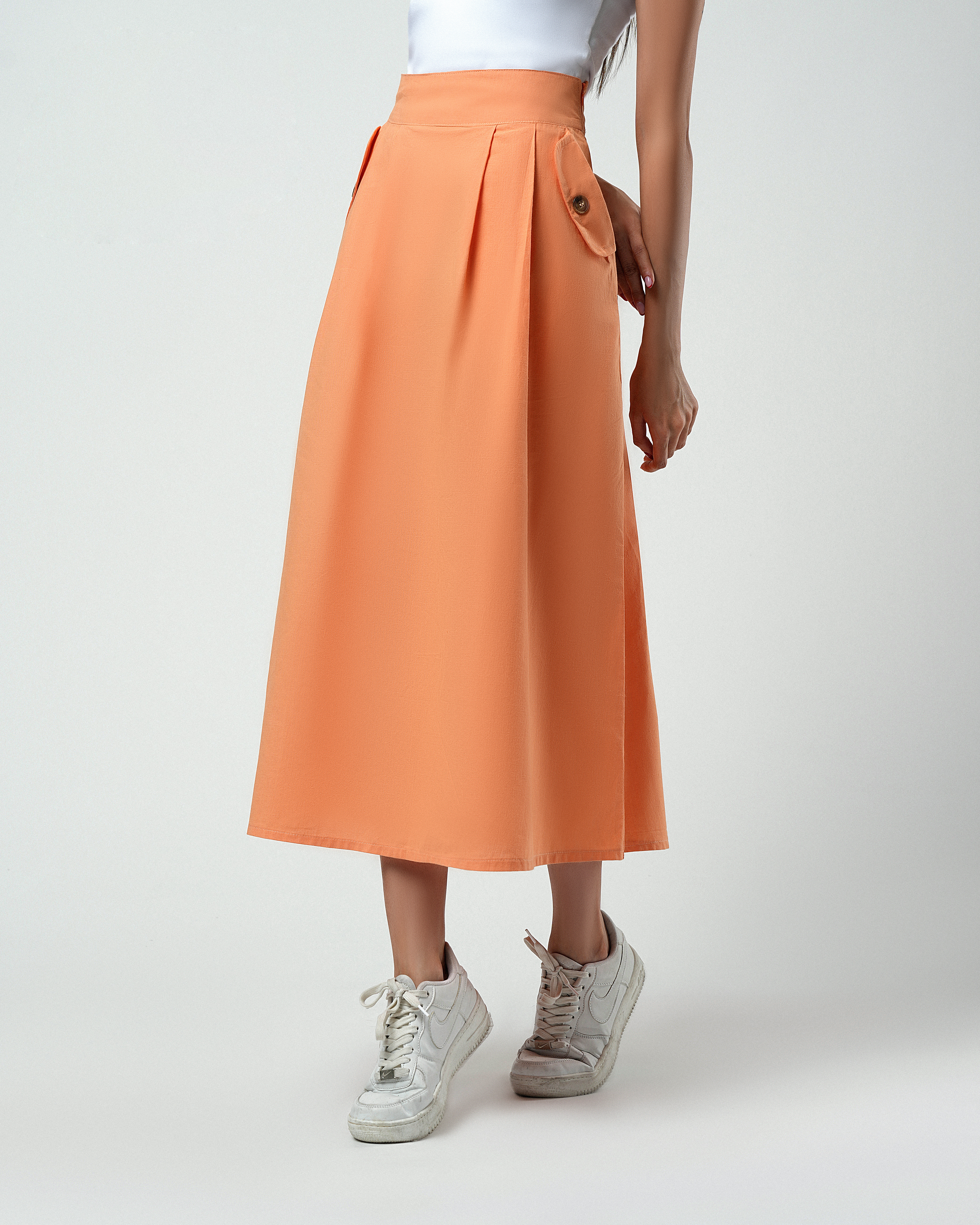 دامنی زنانه با طراحی ساده و رنگ نارنجی شاد که استایلی سرزنده و متفاوت ایجاد میکند.