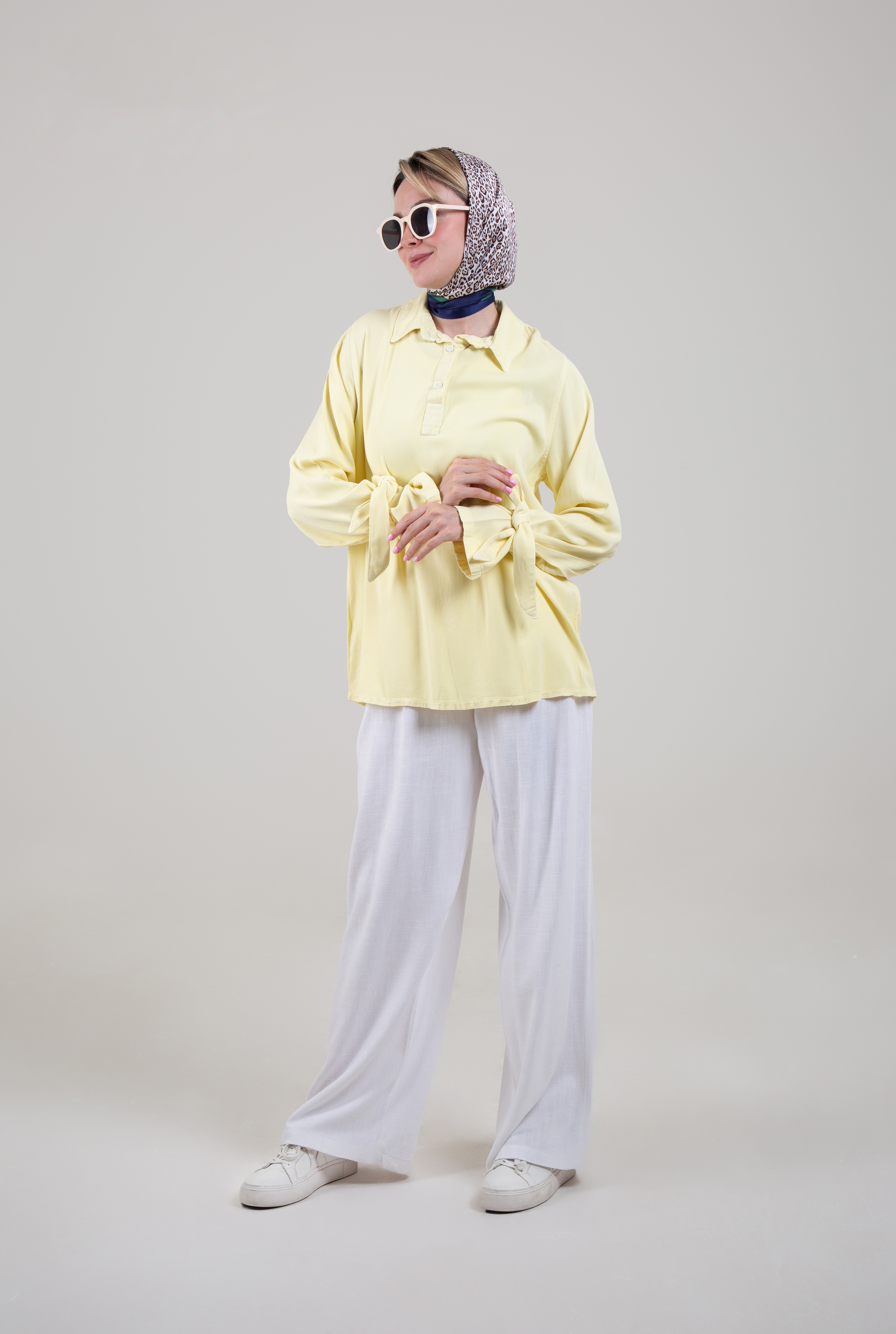شومیز زنانه کد 701631 با طراحی خاص و پالت رنگی شاد انتخابی چشم‌گیر برای خانم‌های جوان است. مدل ویژه طراحی آستین‌های گرهی این شومیز در کنار رنگبندی شاد منجر به متمایز شدن آن از یک شومیز ساده شده است.