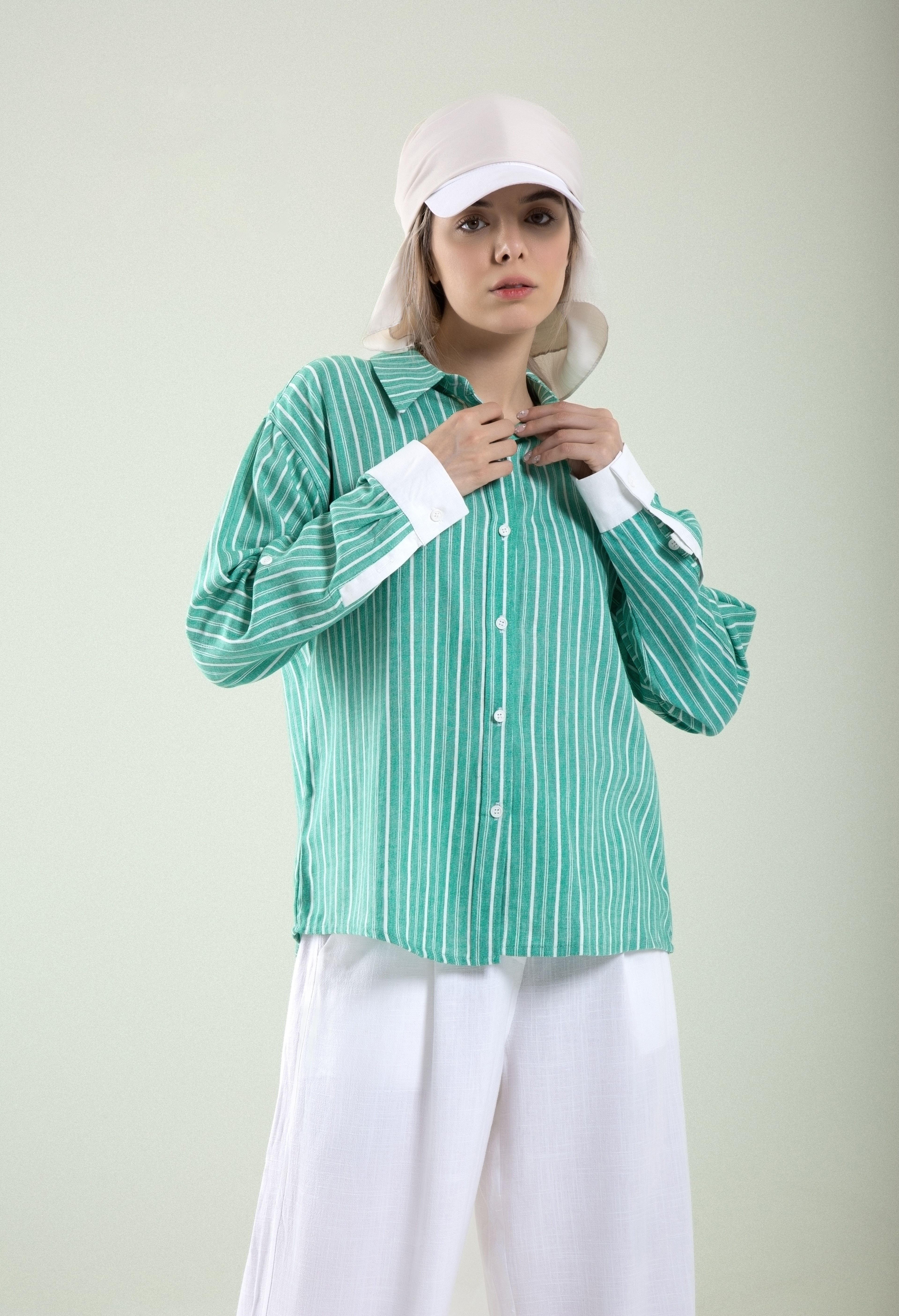 شومیز زنانه کد: 701546، با طراحی خاص و جزئیات چشمنواز؛ یقه مردانه و سرآستینهای متفاوت جلوهای متمایز به این مدل بخشیدهاند