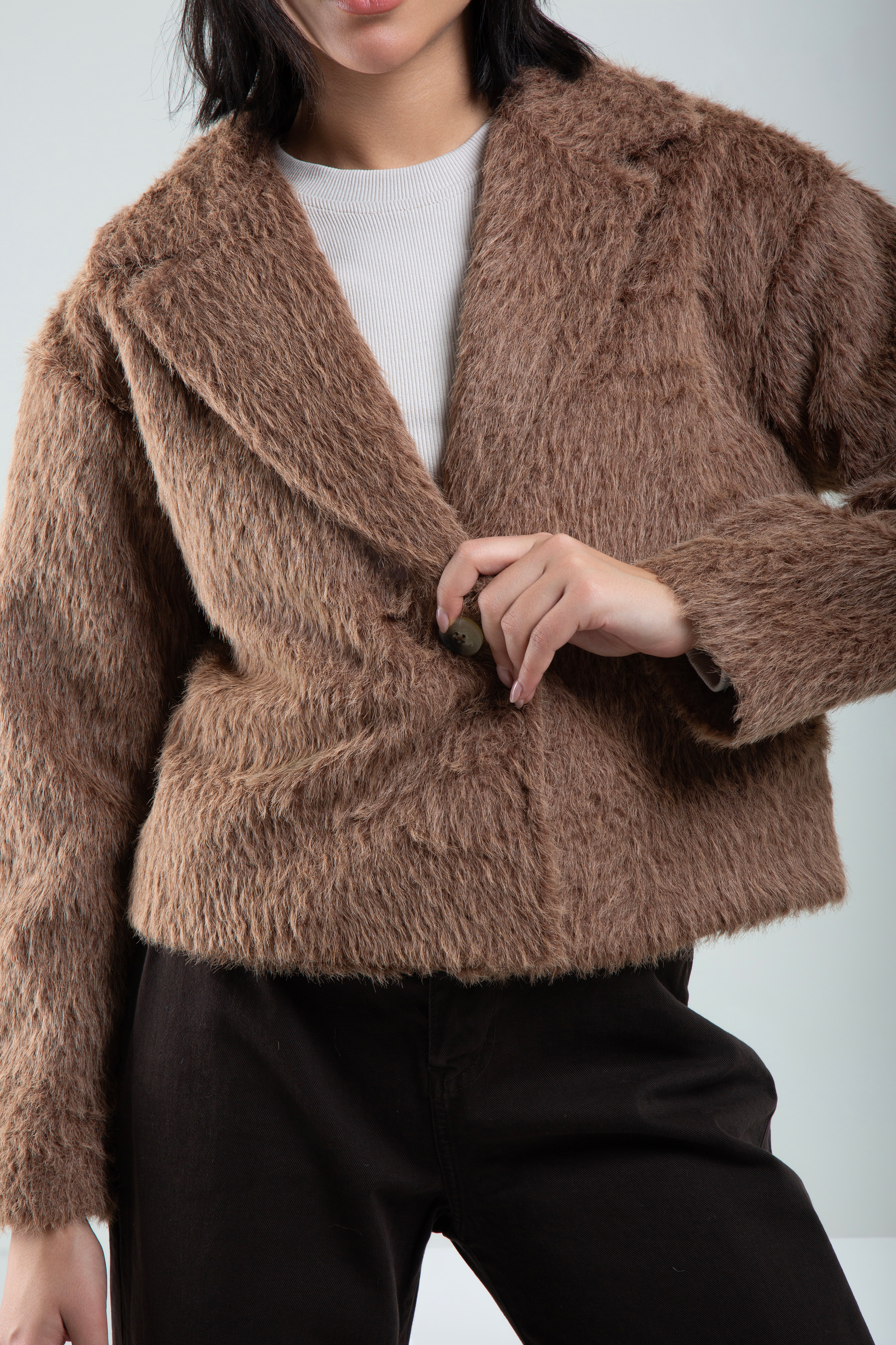 کت خز زنانه کد 509107 یک انتخاب گرم، مدرن و جسور برای فصلهای سرد است. طراحی کراپ با یقه انگلیسی ترکیبی از لطافت خز و فرم شیک کتهای کلاسیک میسازد و نتیجهاش لباسی است که هم برای استایل روزمره جذاب است و هم برای مهمانیها و قرارهای شبانه جلوه متفاوتی دارد. قد کوتاه کت در کنار حجم نرم خز،سیلوئتی خوشفرم ایجاد میکند و بهراحتی با انواع شلوار و دامن، نیمبوت و بوتهای بلند ست میشود.